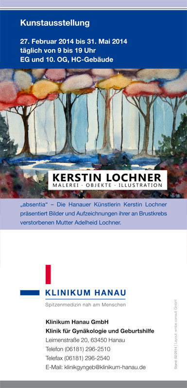 Parallel zu Aquarellen von Adelheid Lochner, die mit 43 Jahren an Brustkrebs starb, im Hanauer Klinikum, fand eine weitere Ausstellung mit meinen Arbeiten im Haus der Begegnung in Frankfurt statt.